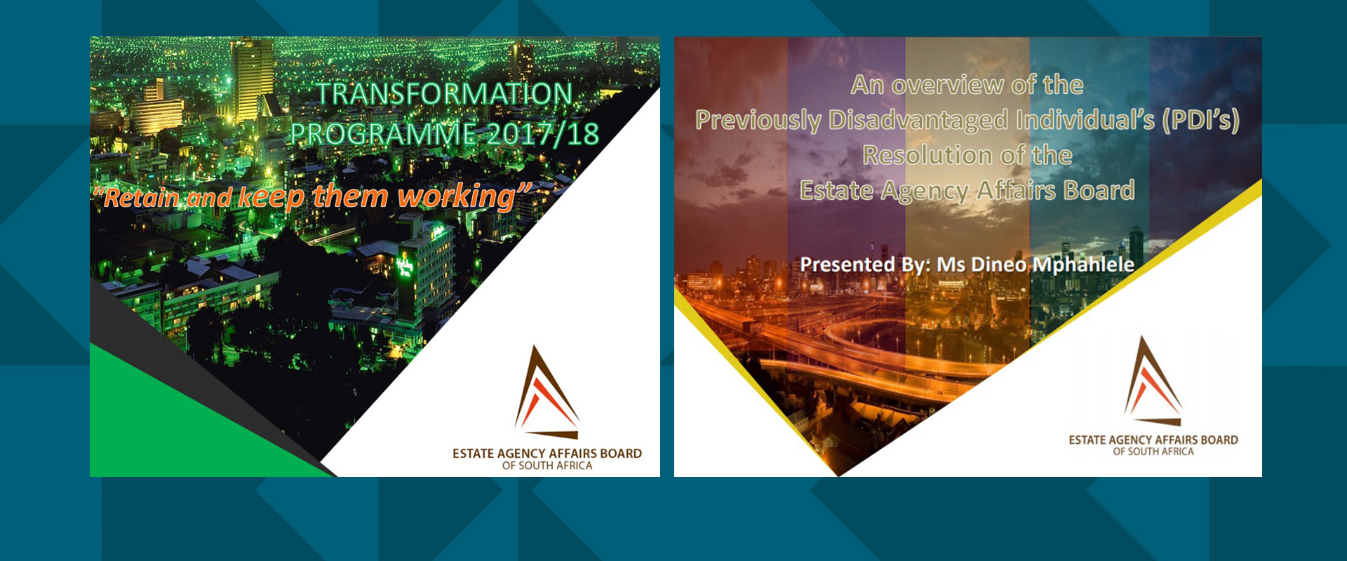 MAIN IMAGE: The first slides from the EAAB’s presentations on their plans to assist with transformation in the property sector. On the left the one made to Parliament last year and on the right, the one showed recently at engagement workshops for PDI’s.